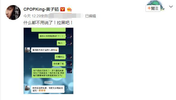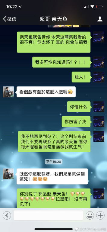 黄子韬12日在微博上分享一张与郭品超的对话截图,并在发文中生气地写道:“什么都不用说了!拉黑吧!”他似乎是在看了最新播出的2集《谈判官》后,为自己剧中的遭遇感到愤愤不平,立刻找郭品超算账直呼:“亲天鱼(秦天宇,郭品超剧中角色)我告诉你,今天这两集我看的很不爽!你太坏了,真的,你合伙搞我。我多可怜你知道吗?!贱人!”