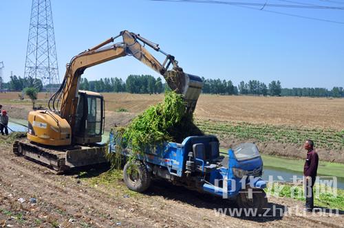 为切实做好环境整治工作,近日,商水县加大环保督察问题整改工作力度,开展大排查、大整治、大扫除行动,确保整改到位。6月12日,一台大型机械正在打捞运送河道水面上的漂浮垃圾(上图);工作人员正在驾驶小船打捞河道水面上的杂草和垃圾(下图)。记者 付永奇 通讯员 魏红 摄