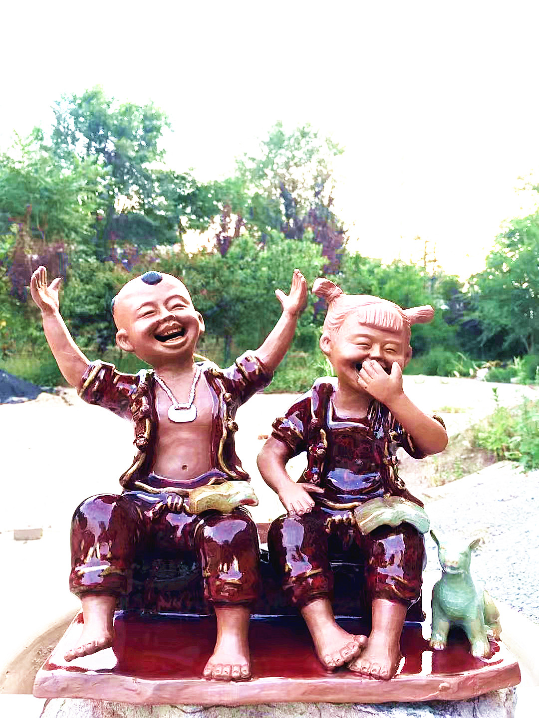 记者采访获悉,张振福钧瓷泥塑作品《童话故事》,表现的是豫东农村的孩子看书的情景,画面中小男孩讲述书中的童话故事,手舞足蹈,逗得小女孩开怀大笑,表现童真、童趣,画面充满着喜庆祥和,从侧面反映了豫东人民的幸福生活。作品长39厘米、宽23厘米高36厘米,是张振福把泥塑和钧瓷完美结合、使用钧瓷矿泥,泥塑局部上釉,更具观赏性。
