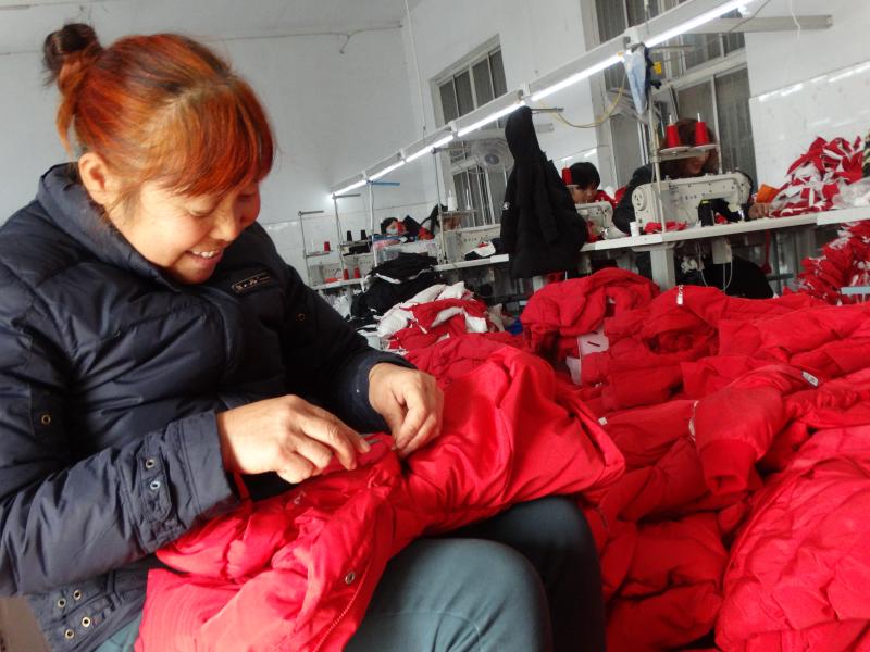 近年来,沈丘县在打响脱贫攻坚战和巩固提升脱贫攻坚成果工作中,大力发展家庭手工业,带动全县5000余名留守妇女家门口就业,年人均增收2万元。左图为11月19日,周营镇马营村留守妇女高英在一个儿童服装加工点忙着剪线头。②5 谢辛凌 摄