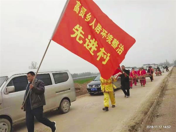 11月17日,高贤乡召开人居环境综合整治表彰暨推进会,对表现突出的5个行政村通报表彰,奖励每个行政村现金3000元,并授红旗一面。图为该乡周岗行政村载誉而归。 记者 马治卫 通讯员 张新鸿 摄