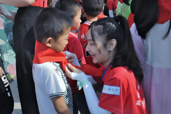 开班仪式上,郑州升达经贸管理学院的支教老师为同学们佩戴了红领巾,伴随着国歌进行了升国旗教育,支教老师进行集体宣誓。支教老师代表作表态发言时说:“很高兴能够来鹿邑周楼小学支教,作为一名当代青年大学生,我们能够担当重任,吃苦耐劳,全身心地完成两周的支教活动,与孩子们快乐相处。”