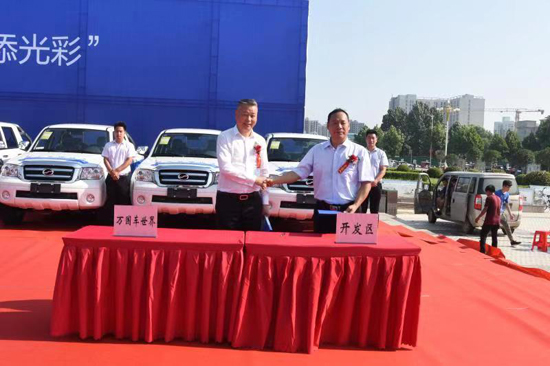 活动现场,由周口市汽车服务行业商会会长、万国车世界董事长吕辉同志与周口经济开发区城管稽查大队队长郭忠斌同志在签约台进行车辆捐赠仪式的签约,并现场进行了捐赠车辆交接。