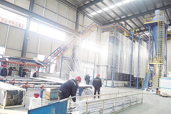 繁忙的生产车间里,工人在加工铝材制品