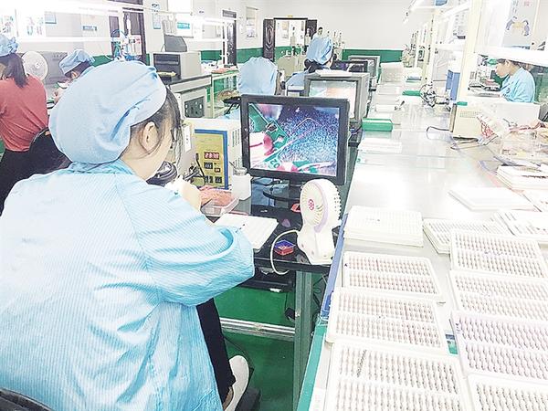 工人通过高精度仪器,加工电子元件