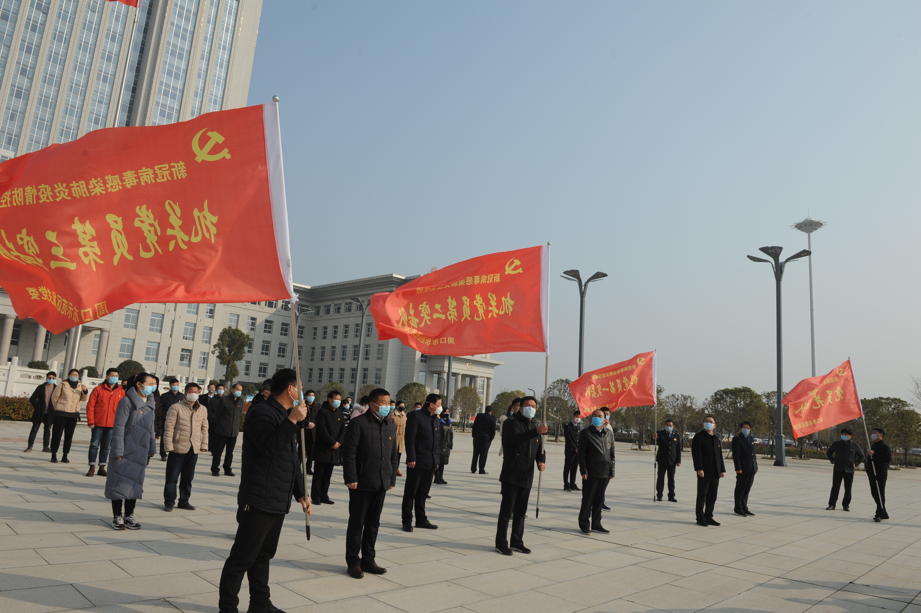 2月3日上午,在国旗下、党旗前,示范区广大党员干部面对党旗重温入党誓词,充分展示了广大党员干部主动请战到战“疫”一线的决心和信心。随后,区机关党委相关领导向党员先锋队和3个党员突击队授予队旗,希望他们坚守在一线、圆满完成疫情防控的各项任务。