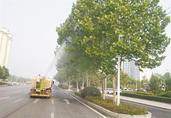 开发区把爱国卫生运动作为精神文明创建活动的重要内容,推进城市精细化管理,改善人居环境,推动爱国卫生运动各项任务落实落细,让市民生活得更美好。图为5月4日早晨,环卫人员对莲花路两侧树木进行喷洒清洗。