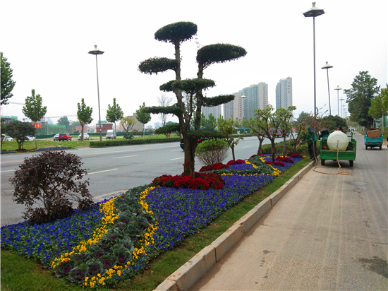 红色、黄色、紫色的花儿,还有造型别致的景观树……10月21日,记者在周口中心城区七一东路上的一处绿化带内看到了这样一组造型别致的景观造型,扮靓了绿化带,给人耳目一新的感觉。记者 张洪涛 摄