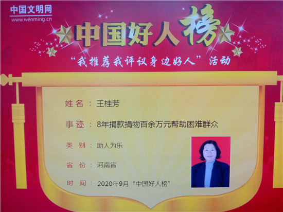 日前,中国文明网公布今年8月、9月中国好人评选结果:太康县第一高级中学党委书记、校长沈世弘从教32年不断求创新,荣登8月敬业奉献类“中国好人榜”;太康县平安养殖专业合作社理事长王桂芳8年捐款捐物百余万元帮助困难群众,荣登9月“中国好人榜”。至此,太康县中国好人上榜人数达66人,位居全国县级市首位。