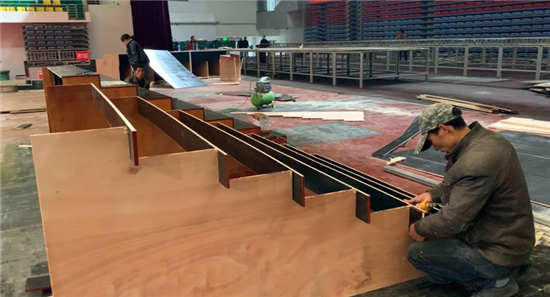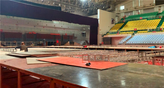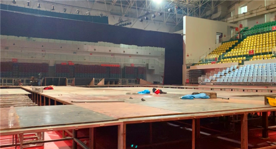 11月23日上午,记者在周口市体育中心看到,由国际名模马艳丽领衔的周商大会国际时装表演秀的舞台正在搭建中。施工工人介绍,时装表演秀舞台预计24日搭建完成,搭建完成后将对舞台进行装饰。