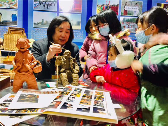 郸城县泥塑艺术大师张振福应邀携48件作品参加大会,成为展会的一大亮点。其中原生态泥塑作品18件,有《磨豆汁》《耕耘》《酒逢知己》《二胡曲》等,钧瓷泥塑作品20件,有《大金蝉》《年年有余》《豫东娃》《瑞牛迎春》等。张振福的作品表现豫东的乡村人物,作品突出个性,憨态可掬,深受观众的喜爱,大家纷纷驻足观看。