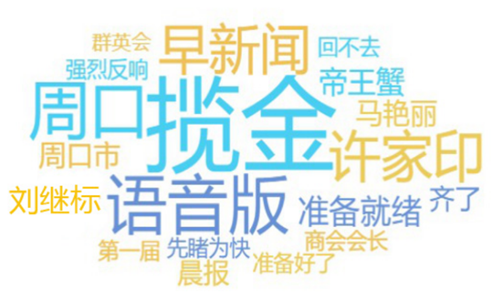 网络热词反映了网民关注的重点,词云图中大大的“揽金”二字占据词云图中央,可见揽金是真的揽金,据悉,首届周商大会签约项目31个,总投资达429.7亿元人民币。“许家印”“马艳丽”在整个图中也是光彩夺目,作为周口人,走上北上广深的成功人士还心心念念家乡的发展,让老乡们倍感温暖,家乡人关注他们为家乡发展做出的努力和他们的动态也是再正常不过了。