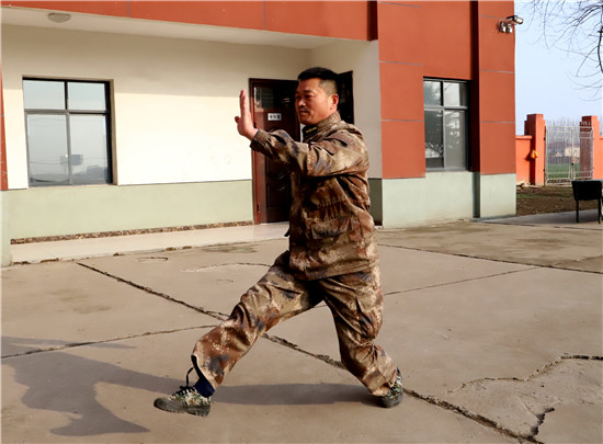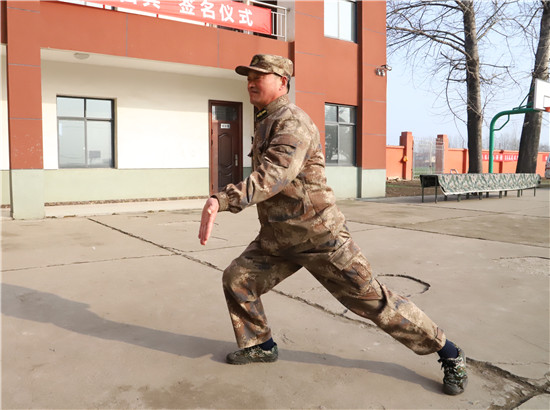 “班长王不老,向班长王学习。好!”准新兵们抱以雷鸣般的掌声。掌声未息,王成华虎虎生风地打了一套军旅拳:弓步冲拳、虚步砍肋、穿喉弹踢……挡击绊腿、转身别臂、击腰锁喉……每一个动作都显得那么的到位,整套下来刚劲连贯、豪情奔放,王成华大气不喘。
