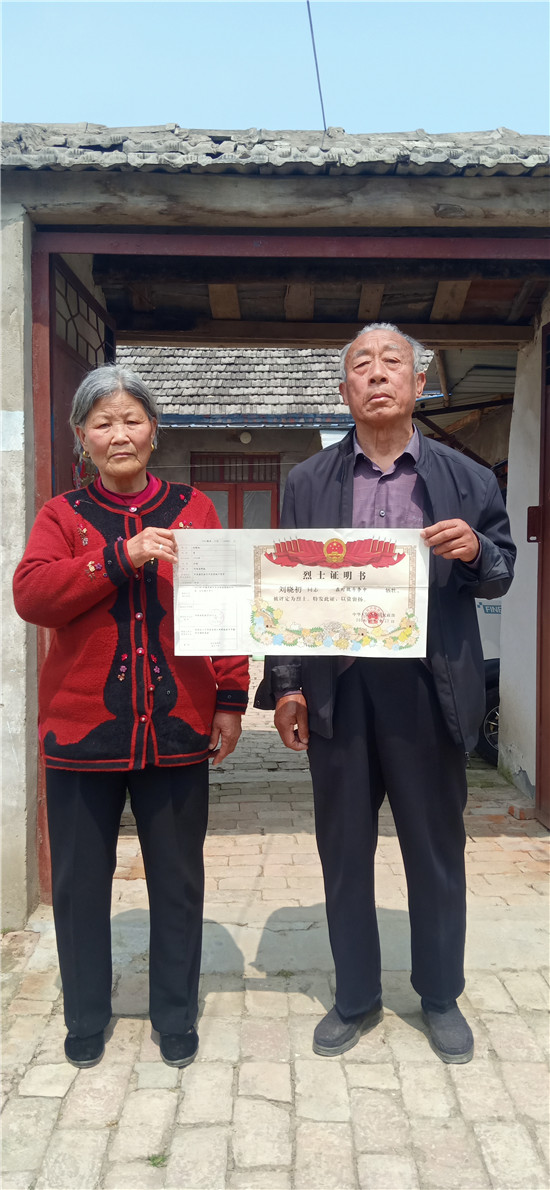 图片说明:刘仰生夫妇展示父亲刘晓初的烈士证明书