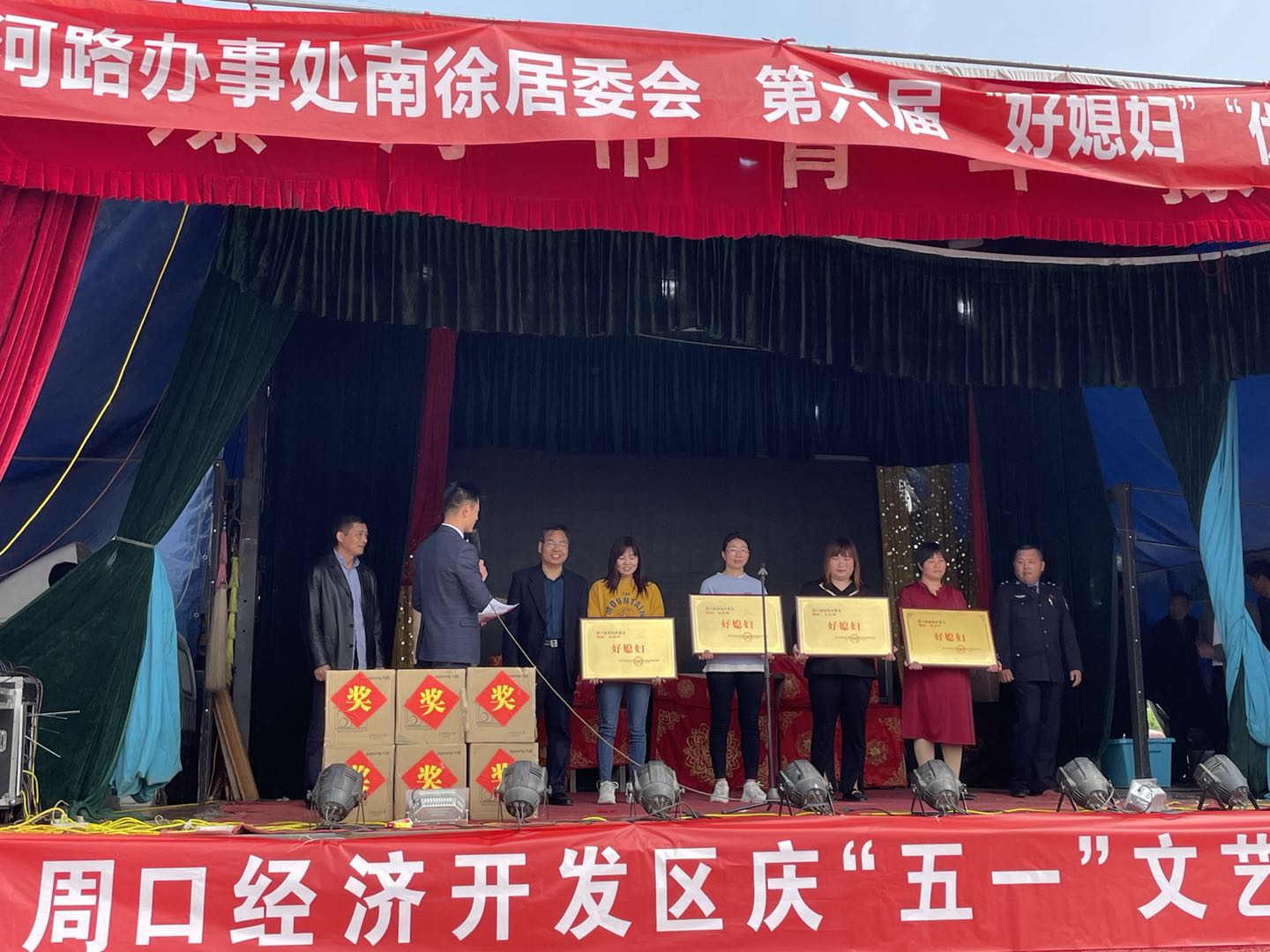 本报讯(见习记者 邱一帆)4月27日,周口市经济开发区淮河路办事处南徐居委会举办第六届“好媳妇”颁奖大会,同时评选出了“优秀党员”。辖区村民王爱华等四人荣获“好媳妇”称号,姚翠兰等2人荣获“优秀党员”称号。活动期间表演了丰富多彩的文艺演出。吸引了大批村民前来观看。
