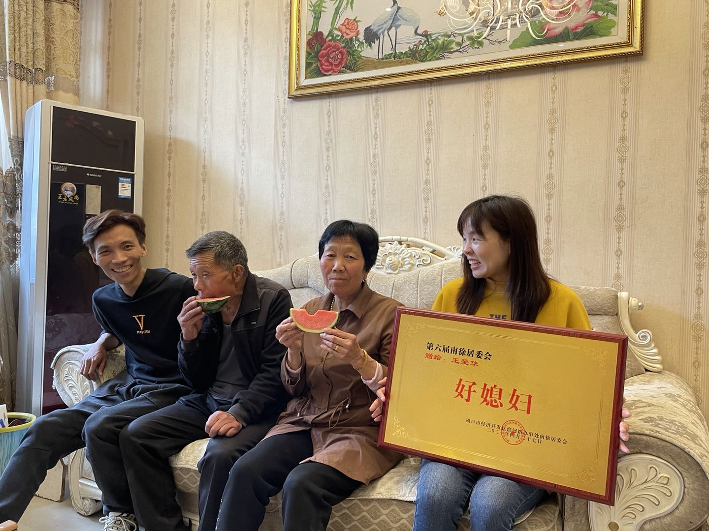 荣获“好媳妇”称号的的王爱华,现年37岁,和丈夫育有2个孩子,在大城市打过工、开过淘宝店,2017年之后,与丈夫一起开始在快手平台上做游戏主播,不仅事业经营的风生水起,家庭关系更是协调和睦。提起儿媳妇王爱华,婆婆赵秀华笑容满面道:“我的儿媳妇在我感冒生病时端茶倒水,特别孝顺,特别懂事,把我们照顾得很好。我们俩从来就没有红过脸、吵过架。”61岁的姚翠兰在这次活动中获得了“优秀党员”称号,她从南徐居委会妇女主任一职退休后一直负责打扫南徐村的卫生,起早摸黑,发挥余热。
