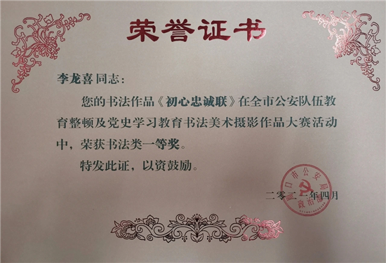 本次大赛,我市民辅警积极参加,踊跃报送,选送书法、美术、摄影作品30余件。其中扶沟县公安局宣传科李龙喜、交警大队厉夯等人的书法《初心忠诚联》《习近平讲话选抄》等作品分别荣获书法类一等奖、二等奖;扶沟县公安局宣传科闫晓凤等人的摄影作品《晨读》、《走访话安全》等分别荣获摄影类二等奖、三等奖。此次大赛,全面筑牢了民辅警忠诚履职的思想根基,切实把教育整顿及党史学习教育活动的成果转化为思想成果和工作成果。充分展示了扶沟公安坚定的理想信念和良好的精神风貌。②9
