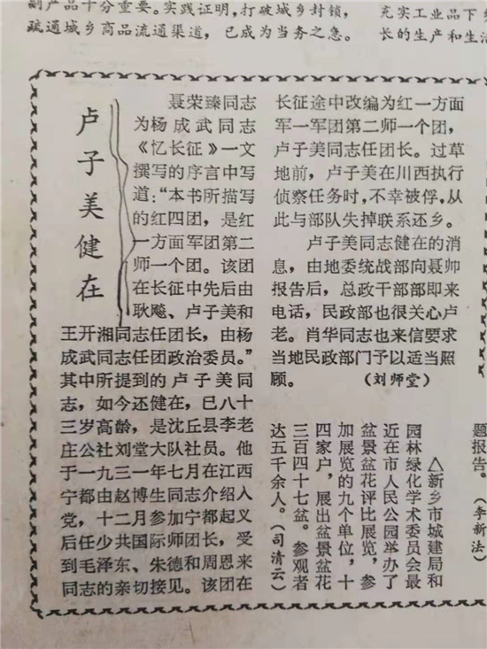 4月9日,周口日报《红色记忆》采访组一行再次来到沈丘县李老庄乡卢子美家乡采访,并到卢子美的墓前凭吊。恰逢清明节后,卢子美墓碑前摆放了一盆白色菊花,花朵在风中摇曳,像是在倾诉着什么。“应该是有人专程过来扫墓了。”卢远东拿起那盆菊花,细心地擦拭底部尘土。他说: “爷爷去世多年,给我们留下了无穷尽的精神财富。勤俭是我们的传家宝,气节是我们做人的标本,诚信待人也是爷爷对我的教导。我们后人要把党的初心传承发扬光大。”③6