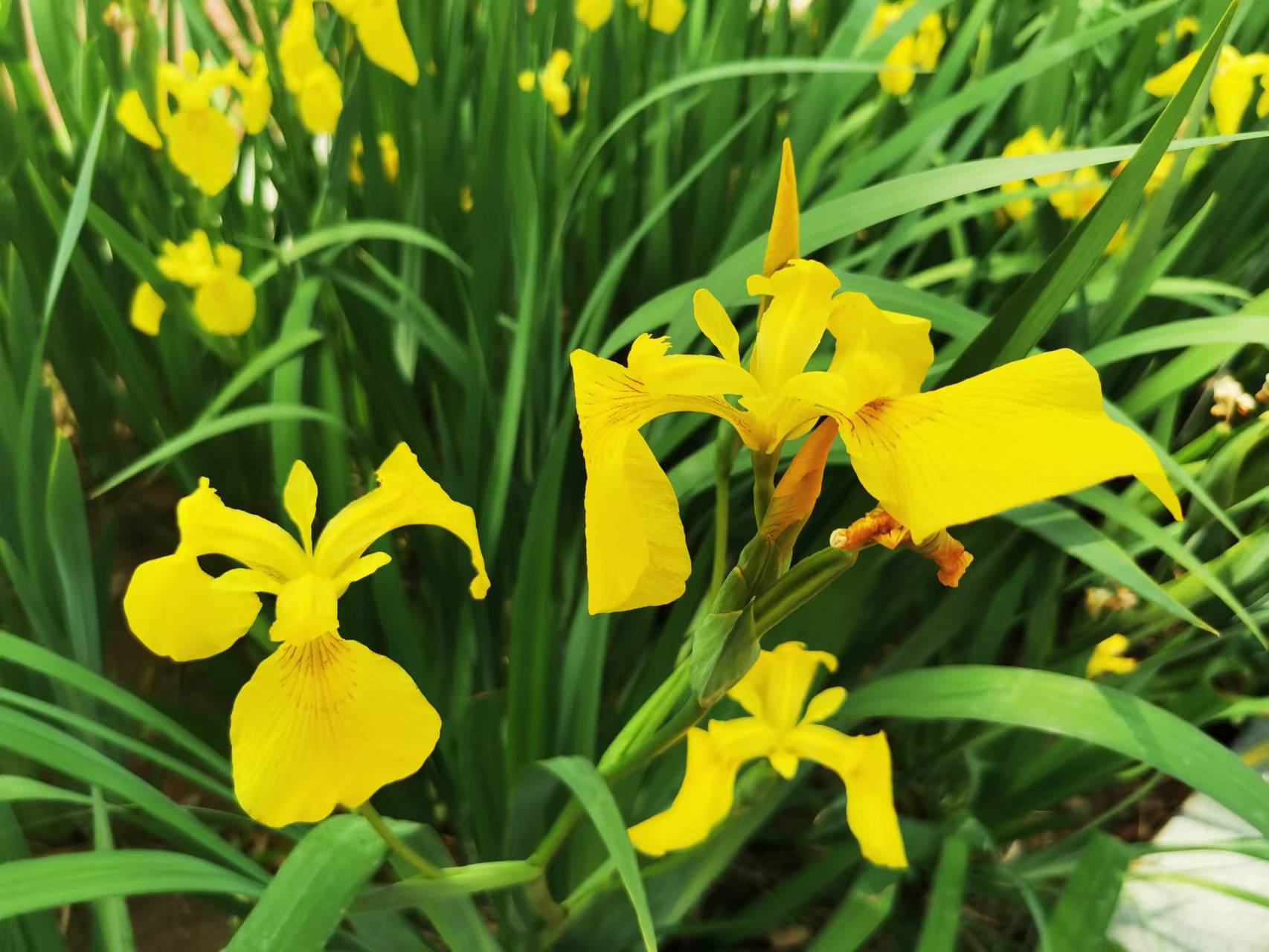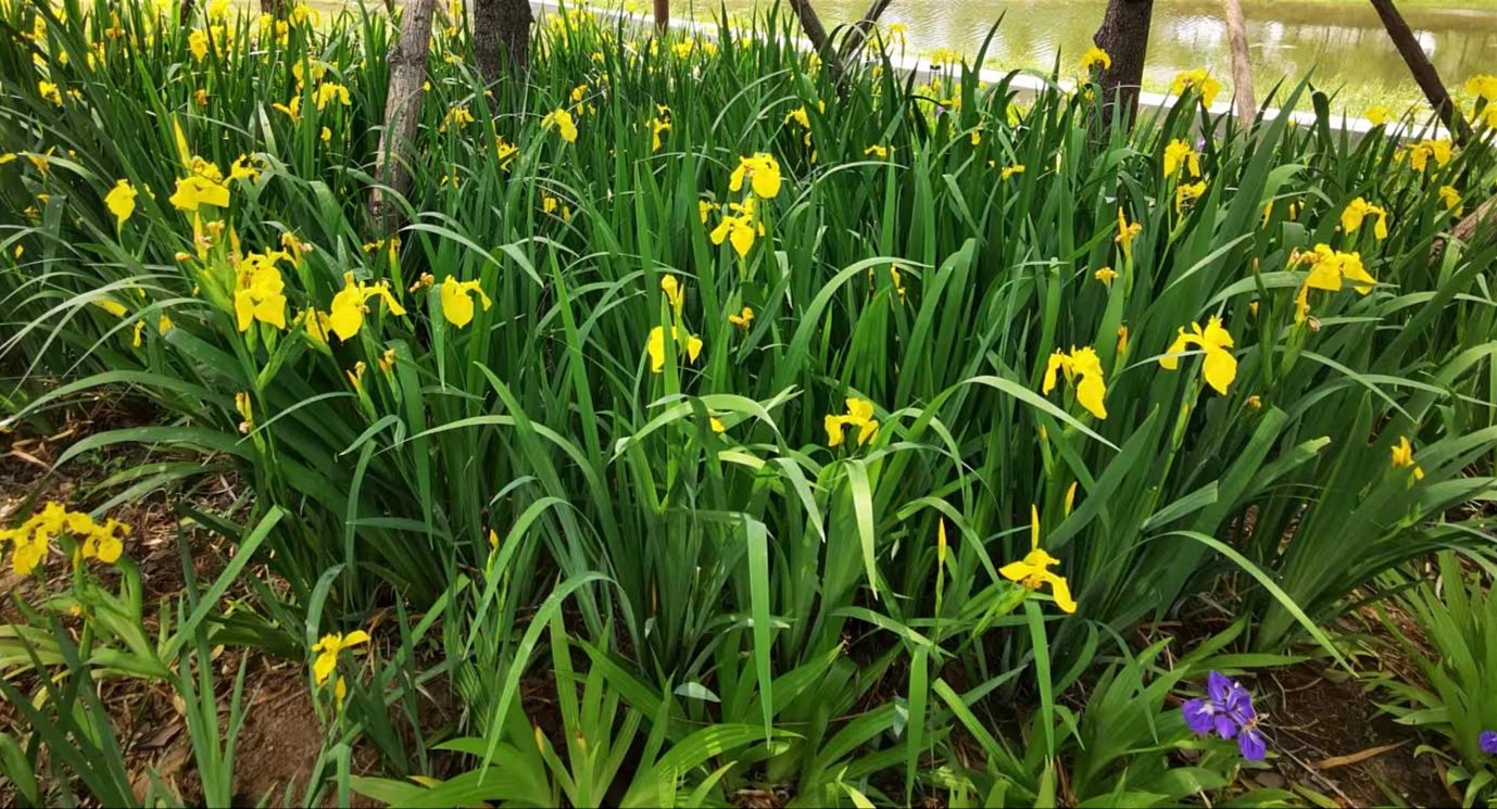 现在,滨河公园里的黄菖蒲花开正盛,碧绿的叶子,一串一串黄色的花,非常好看。③3