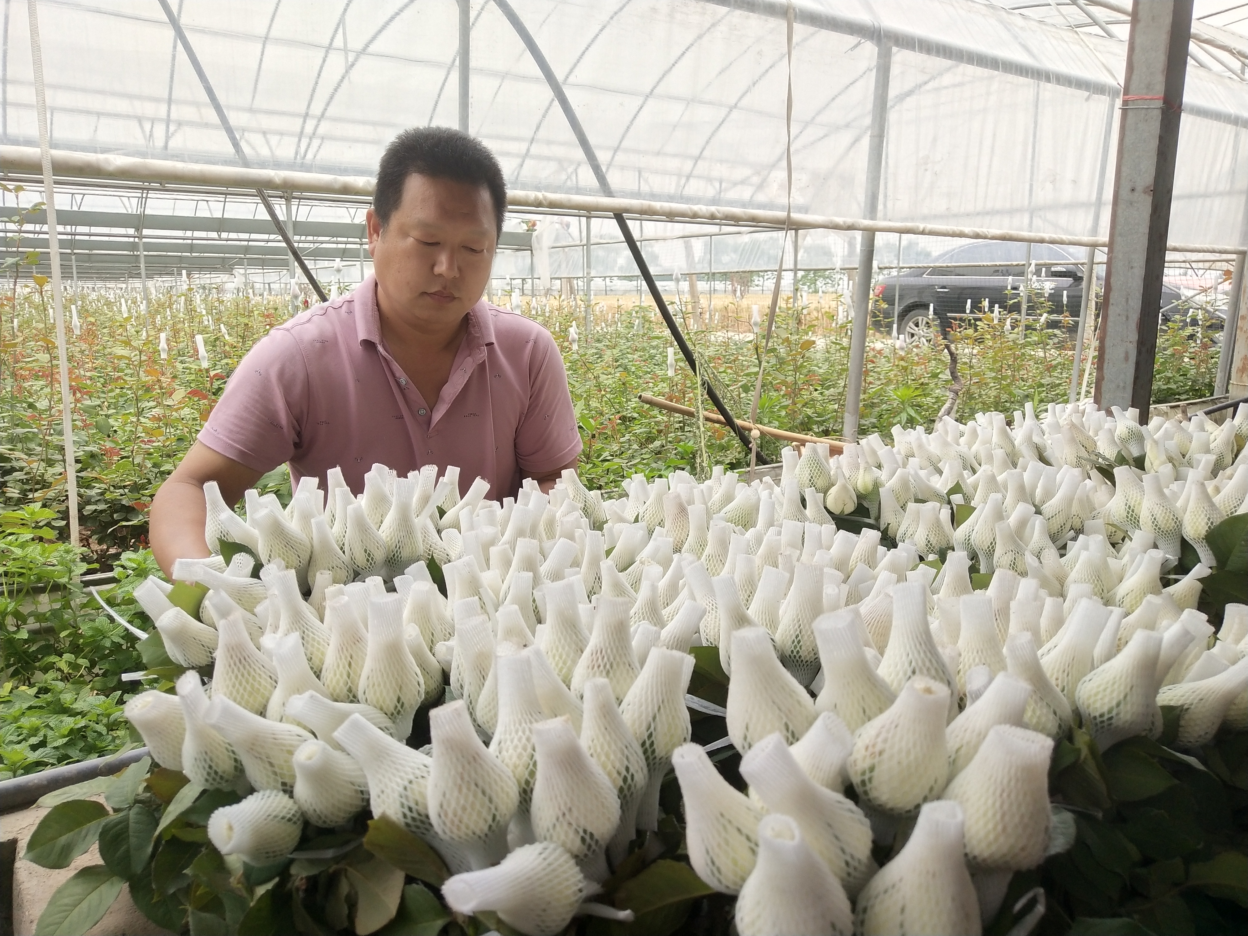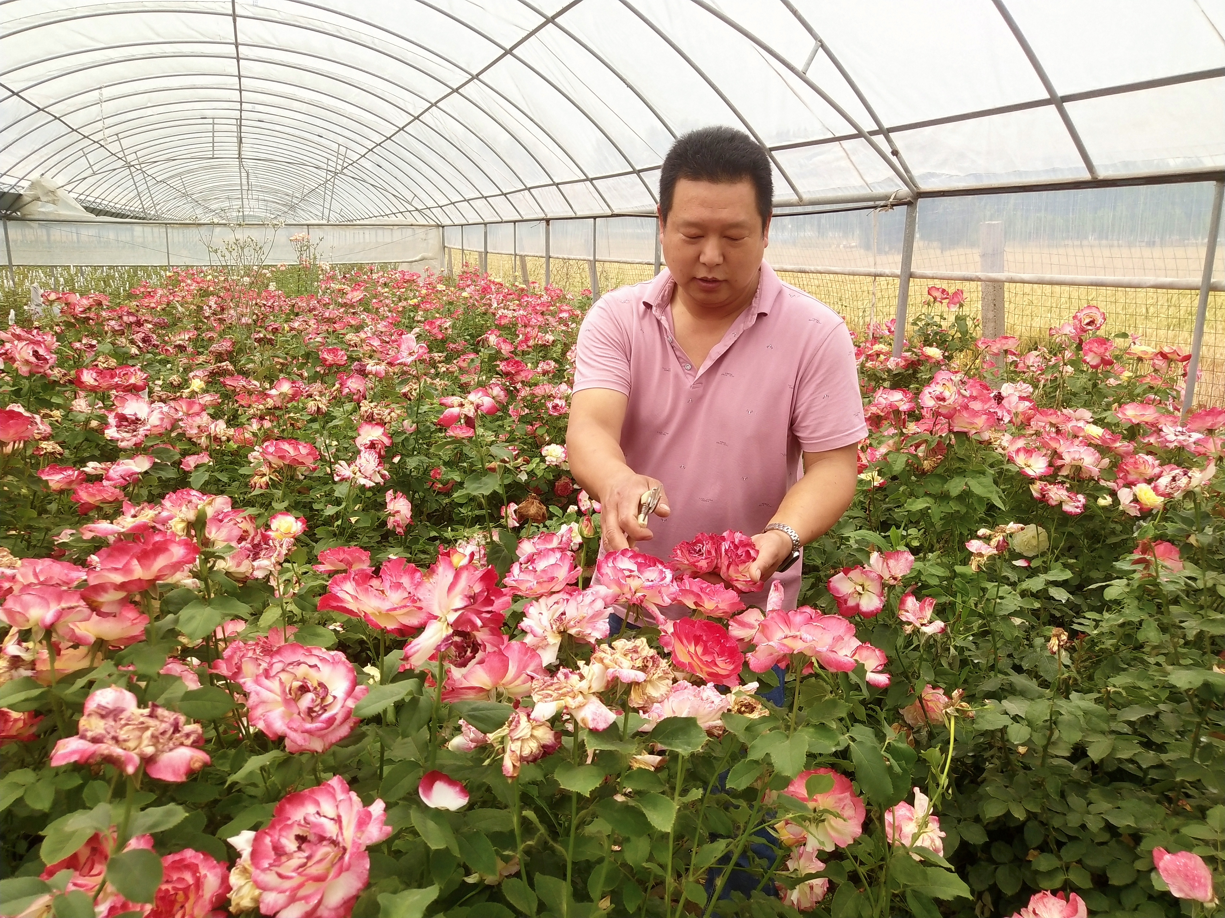 5月22日上午,记者在商水县平店乡雒庄村千亩玫瑰园看到,田野里观赏玫瑰大棚和食用玫瑰片区交相辉映。一棚棚玫瑰品种多样、形态各异,红的、粉的、黄的、紫的、粉中带红的,有的含苞待放、有的花瓣初绽、有的花开正艳,阵阵花香扑鼻而来。花农们在花丛中来回穿梭,套袋、修剪、采摘、装运,一派繁忙景象、美好风光。