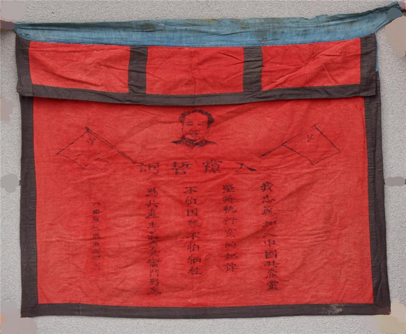 在德高民俗博物馆,陈列着这样一面旗帜,旗身长约90厘米,宽约70厘米,旗帜上印有毛泽东同志头像及入党誓词文字,旗帜左下方印有“八路军抗战指挥部制”落款文字,该入党誓词旗帜为抗日战争时期制作完成。凝视这面旗帜,对革命先烈的钦佩感油然而生。