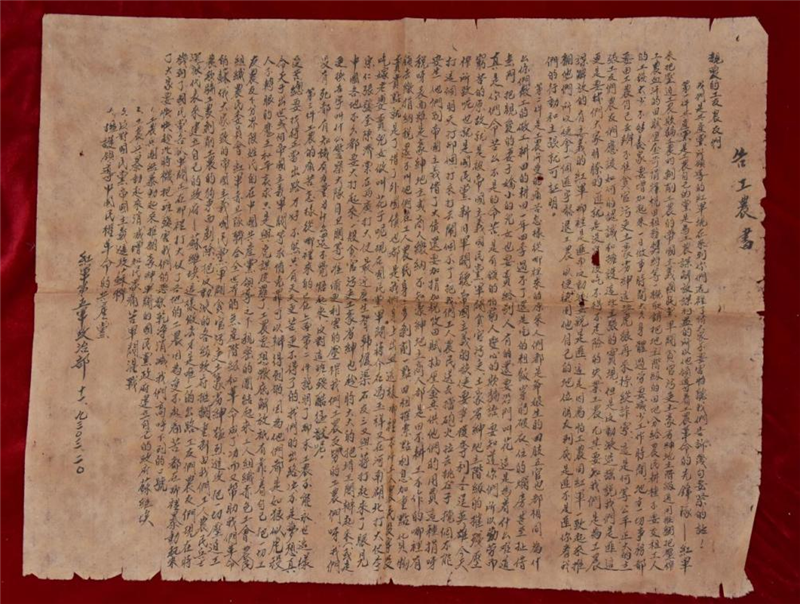 《红军第五军政治部告工农书》为馆内红色藏品的重要一件,长约56厘米,宽约45厘米,字迹清晰,保留完整,泛黄的纸张透露出历史沧桑感。