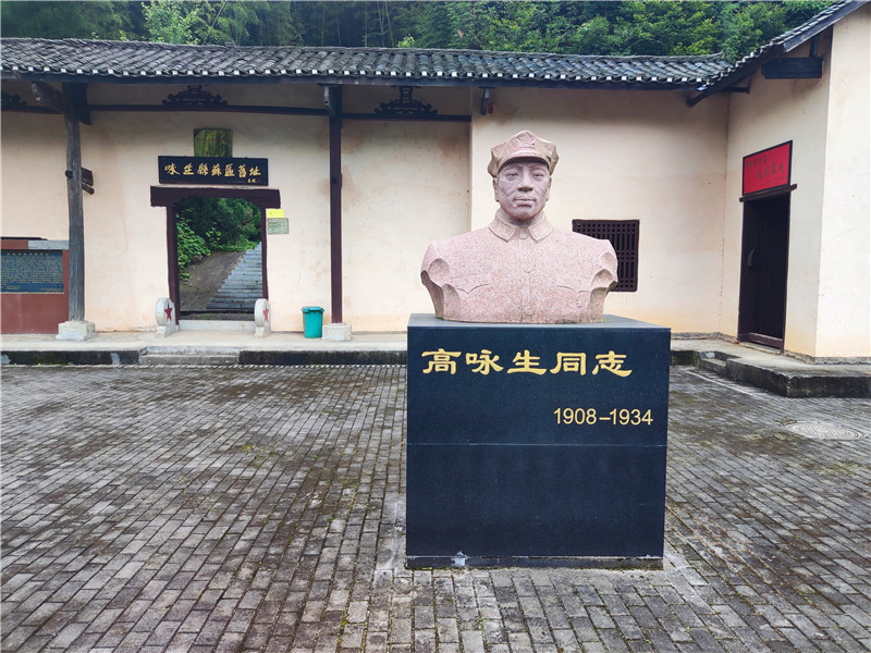 旧址前广场上,有高咏生烈士石刻雕像。他头戴红军帽,目光如炬,深情地望着远处的苍茫青山,流露出欣慰的笑容。记者轻轻抚摸雕像。此时此刻,沉默恰是最好的语言。