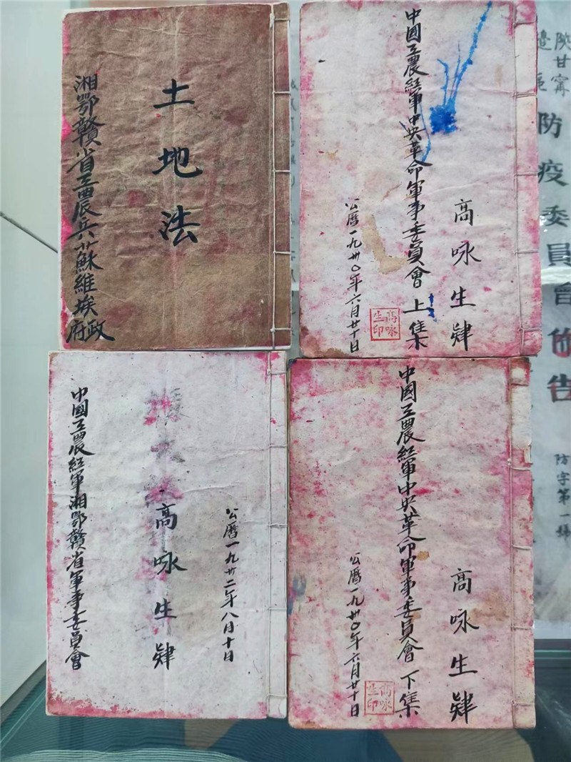 李洪东收藏的高咏生手写笔记共有四本,包括高咏生用毛笔抄写的公文《中国工农红军中央革命军事委员会》文件上集和下集、《湘鄂赣省工农兵苏维埃政府土地法》、1932年书写的文件《目前扩大红军的计划大纲》。文件上面都有“高咏生肄”几个字,盖“高咏生印”大红印章。