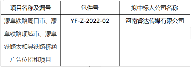 漯阜铁路周口市、漯阜铁路项城市、漯阜铁路太和县铁路桥涵广告位招租项目评标结果公示