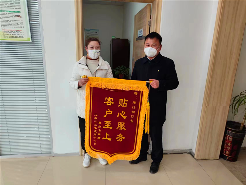 “项城莲花大道支行的工作人员服务热情,办事靠谱,处处为我们着想,钱存在这里,我十分放心!”2月12日,项城市单女士为建行周口分行项城莲花大道支行送来一面写有“客户至上 贴心服务”的锦旗, 对莲花大道支行全体工作人员的热情高效、认真负责的工作态度表示认可和感谢。单女士十分感激地把锦旗递给了项城莲花大道支行负责人胡洋洋,并为其点赞。