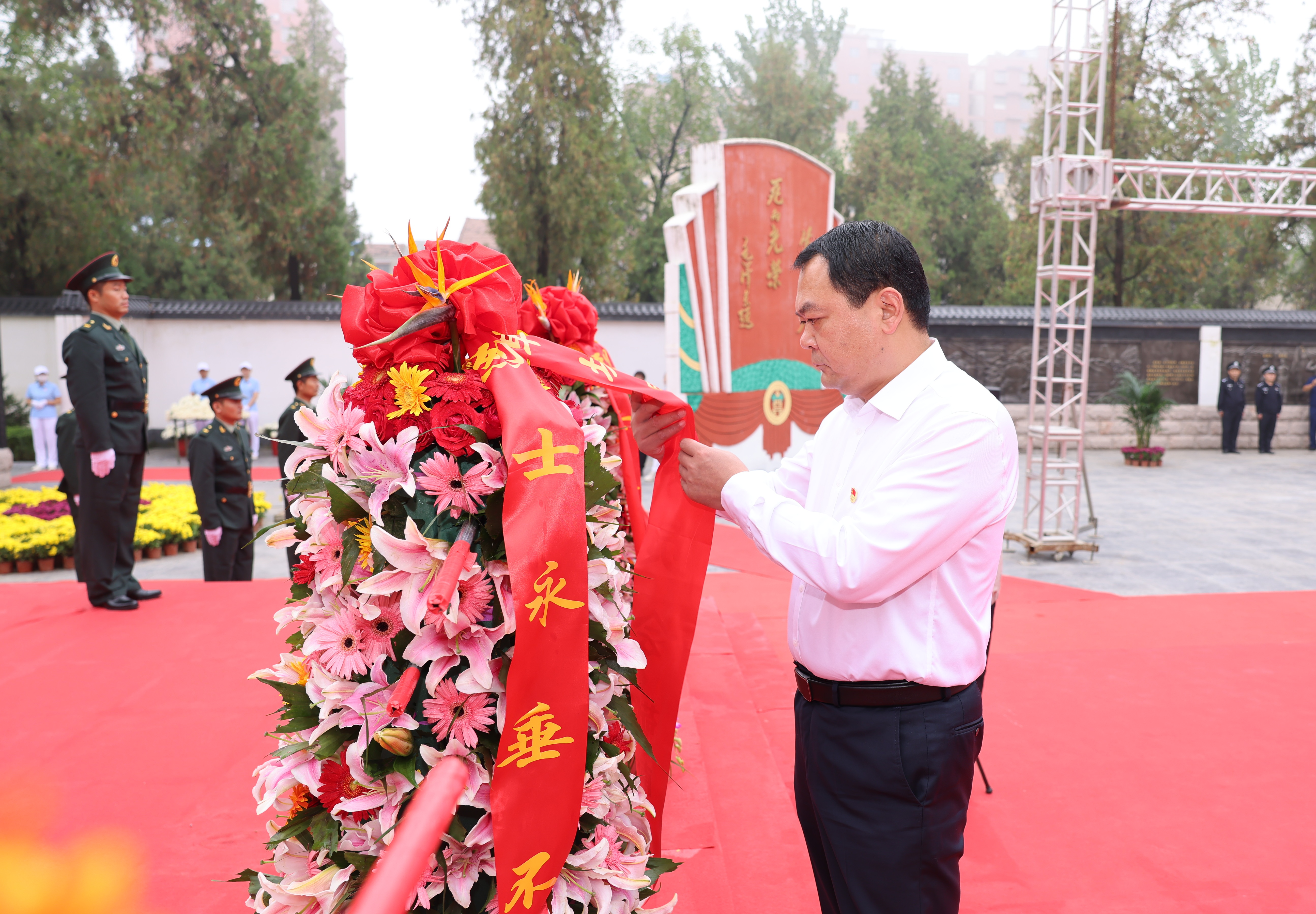 李全林神情庄重地缓步上前,代表县委、县人大、县政府、县政协、县人武部仔细整理花篮缎带。