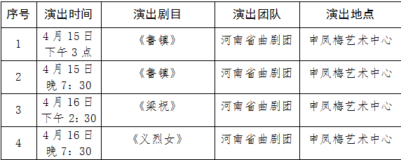 4月15日至16日,“中原文化大舞台”在周口市安排4场经典剧目演出。具体安排如下: