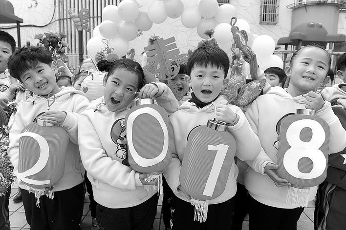 2017年12月28日,在安徽省阜阳市一家幼儿园内,孩子们展示自制的节日灯笼,迎接2018年的到来。
