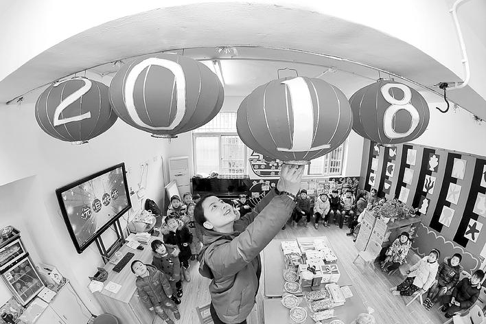 2017年12月29日,在江苏省常州市钟楼区科技幼儿园,一名老师在教室里悬挂写有“2018”字样的灯笼,迎接2018年的到来。