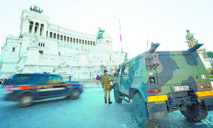 2017年12月29日,在意大利首都罗马,士兵在威尼斯广场执勤。新年前夕,欧洲各国主要城市在交通枢纽、旅游景点等地加强安保措施,防止袭击事件发生。 新华社发