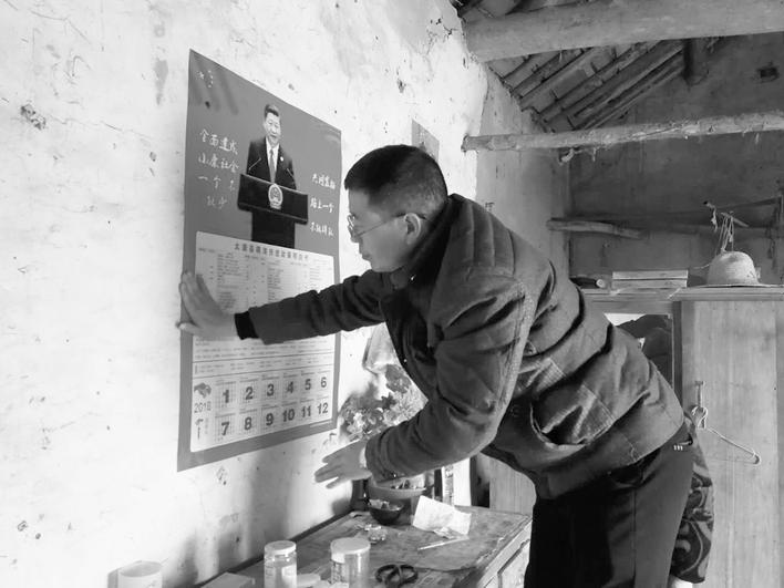 2017年12月31日,太康县组织党员干部到贫困户家中集中宣传扶贫政策。图为县审计局驻板桥村大朱庄第一书记入户张贴政策明白卡。王莹 摄