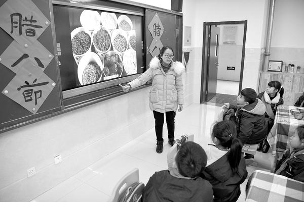 1月23日,合肥市建平实验小学老师沈美艳向孩子们讲解腊八节的民俗知识。当日,在“腊八节”即将到来之际,安徽省合肥市建平实验小学举办主题活动,让孩子们了解“腊八节”的相关民俗知识,感受中国传统文化。新华社记者 刘军喜 摄