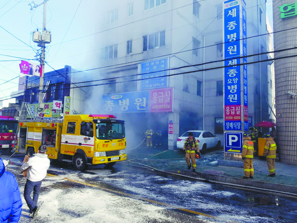 1月26日,在韩国南部密阳市,消防人员在事发现场展开救援。韩国消防部门说,韩国南部密阳市一家医院26日发生火灾,已造成15人死亡。新华社发