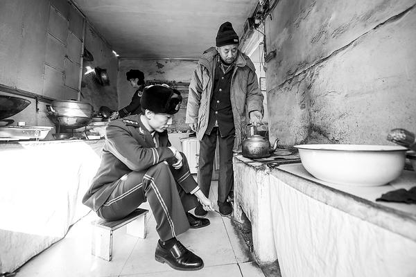 2月1日,大连湾边防派出所官兵为贫困户家检查炉灶是否可以正常使用。