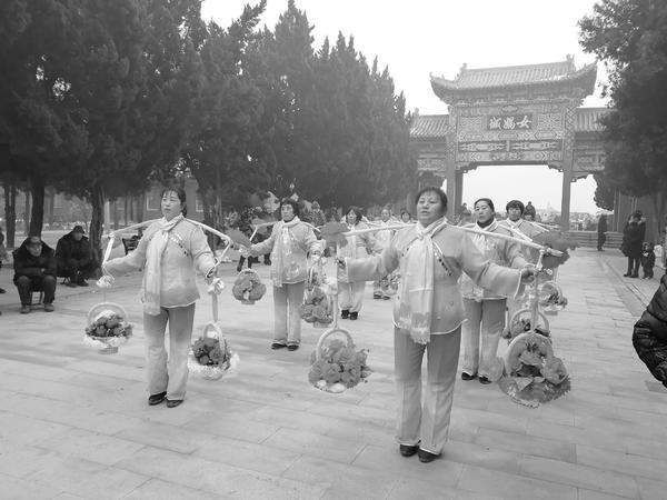 这一天是1月17日,腊月初一。这一天,大雾迷漫,我们采访组从周口到西华,没能走高速。可是这一天,我们在上午九点多到达时,盘古女娲创世文化广场上已经聚集了许多商贩,熙熙攘攘,人声鼎沸。从景区大门到补天殿50米长的路上,有三队担经挑的表演队伍在表演。前来祭拜的香客有的从旁边穿行,有的驻足观看。