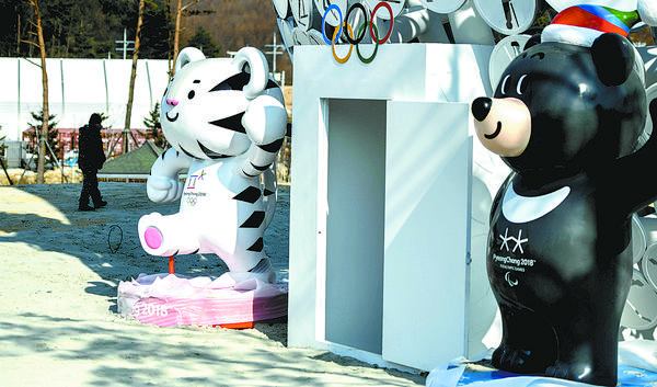 这是2月8日在平昌主新闻中心附近拍摄的平昌冬奥会吉祥物白老虎“守护郎”和冬残奥会吉祥物黑熊“月牙熊”的雕塑。2018年平昌冬奥会开幕在即,平昌冬奥会吉祥物白老虎“守护郎”几乎无处不在地在为平昌冬奥会“暖场”。新华社记者 王昊飞 摄
