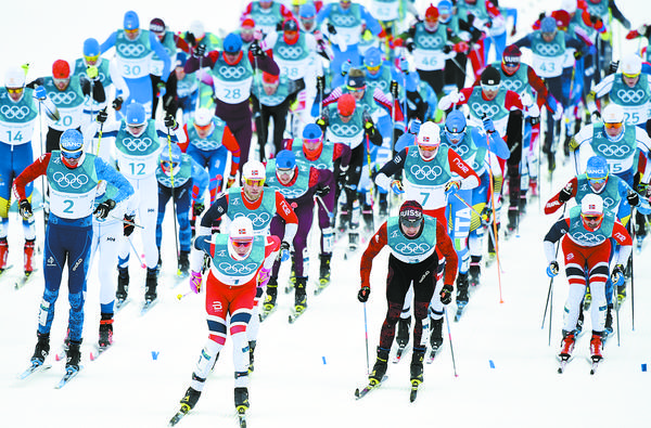 2月11日,参赛选手在比赛中。当日,2018年平昌冬奥会越野滑雪男子15公里+15公里双追逐比赛在阿尔卑西亚越野滑雪中心举行。新华社记者 王松 摄