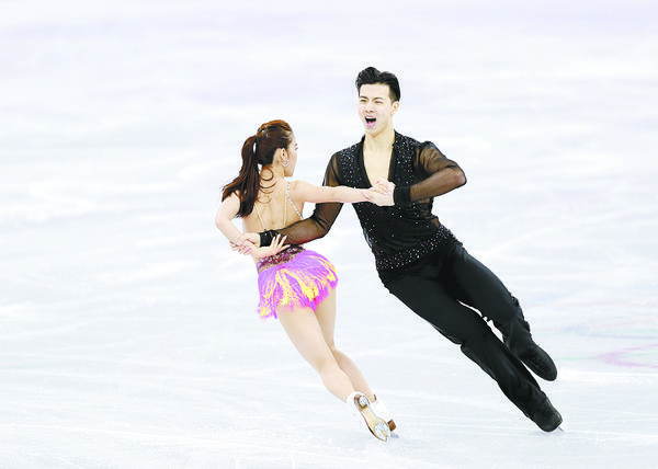 2月11日,中国选手王诗玥(左)/柳鑫宇在比赛中。他们以56.98分位列该项目第七名。当日,2018年平昌奥运会花样滑冰团体赛冰舞短节目比赛在江陵冰上运动场举行。新华社发