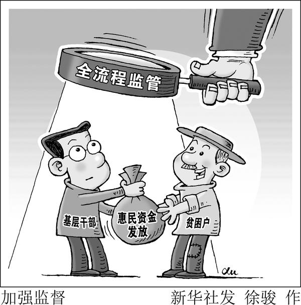加强监督 近年来,国家惠民力度不断加大,每年用于惠民项目的专项资金也越来越多。2017年政府工作报告显示,仅全国财政专项扶贫资金投入就超过1000亿元。 记者近期走访全国10余个乡镇发现,惠民资金发放到农民手中的“最后一公里”,是一个复杂的系统工程。在扶贫攻坚和反腐倡廉的背景下,乡镇基层干部承受着巨大压力和严峻挑战。多位乡镇干部建议,对惠民资金的使用从体制机制上健全监管全流程,引入社会监督,主动公开公示,让惠民项目更加透明公开。新华社发