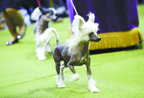 2月12日,在美国纽约举行的威斯敏斯特犬展上,中国冠毛犬参加纯种犬展示赛。威斯敏斯特犬展历史悠久,今年已是第142届,是犬界的年度盛会之一。本届赛事吸引了来自世界各地200多个品种的约2800只狗狗齐聚一堂,一展风采。新华社发