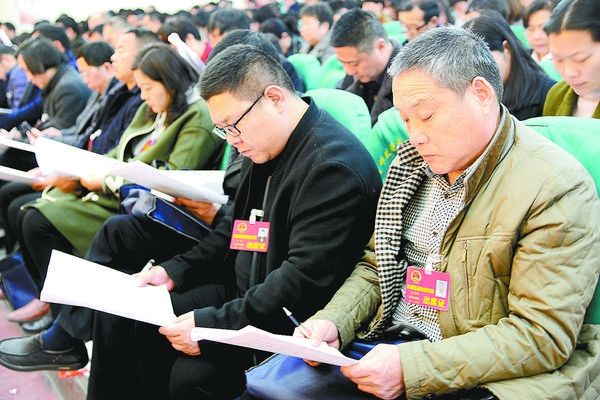 出席市四届人大三次会议的代表认真学习政府工作报告。记者 孙安平 王映 摄