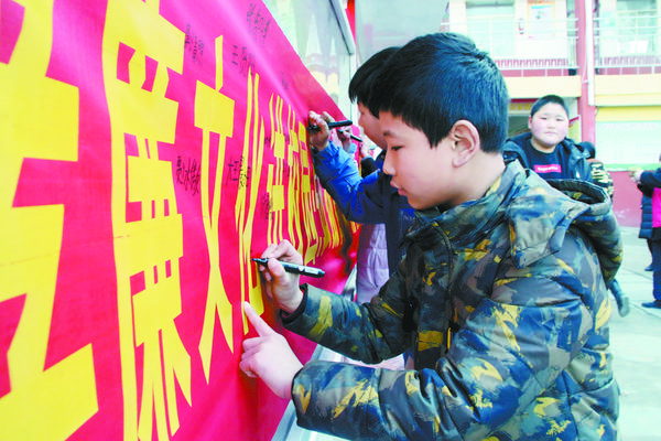 今年是毛泽东“向雷锋同志学习”题词55周年。3月5月,沈丘县纪委联合县义工联走进沈丘二高、河南小学,开展“孝廉文化进校园”活动,旨在弘扬雷锋精神和“孝善俭廉”的美德。图为学生们在“弘扬雷锋精神,做‘孝善俭廉’美德少年”条幅上签名。 王佳佳 辛曼 摄