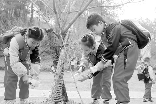 植树添新绿 3月12日,江西省吉水县中心幼儿园的小朋友在公园里为刚栽种的树苗浇水。当日是植树节,全国各地开展各类植树活动,人们行动起来植树添绿,美化环境。 新华社发