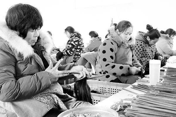 3月13日,项城市丁集镇奥发发艺精准扶贫车间内,工人们正在熟练制作发辫。
