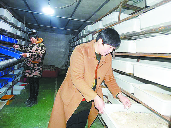 3月17日,沈丘县周营镇的留守妇女王海霞和赵素花在沈丘县远航蜈蚣养殖合作社分拣黄粉虫。近年来,沈丘县妇联积极实施“巧媳妇工程”,通过技术培训、资金扶持、减免税费等优惠政策,帮助1200多名巧媳妇投身于创办小微企业,让当地20000余名留守妇女家门口实现就业。 韦伟 谢辛凌 摄